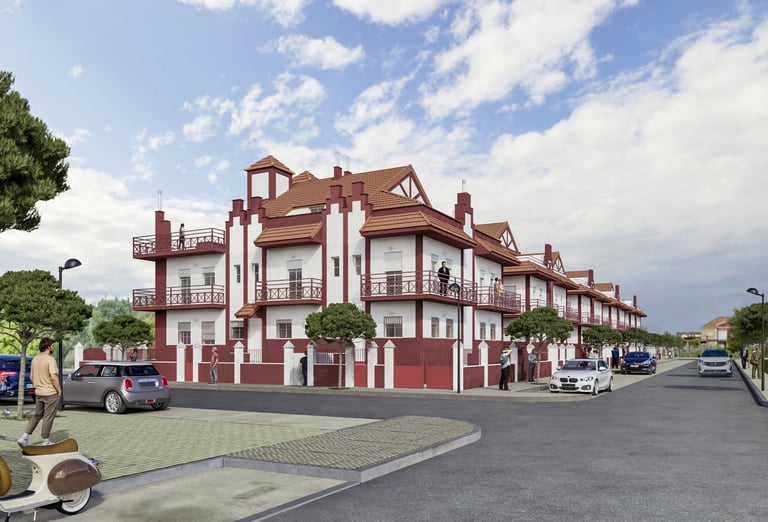 La fachada combina elegancia y carácter con el contraste entre tonos burdeos y blanco, logrando una imagen atractiva y equilibrada que respeta la estética del entorno y aporta coherencia al conjunto residencial.