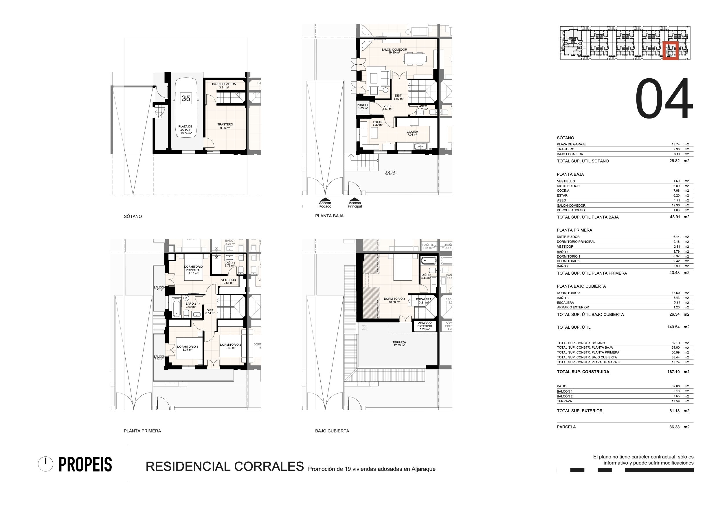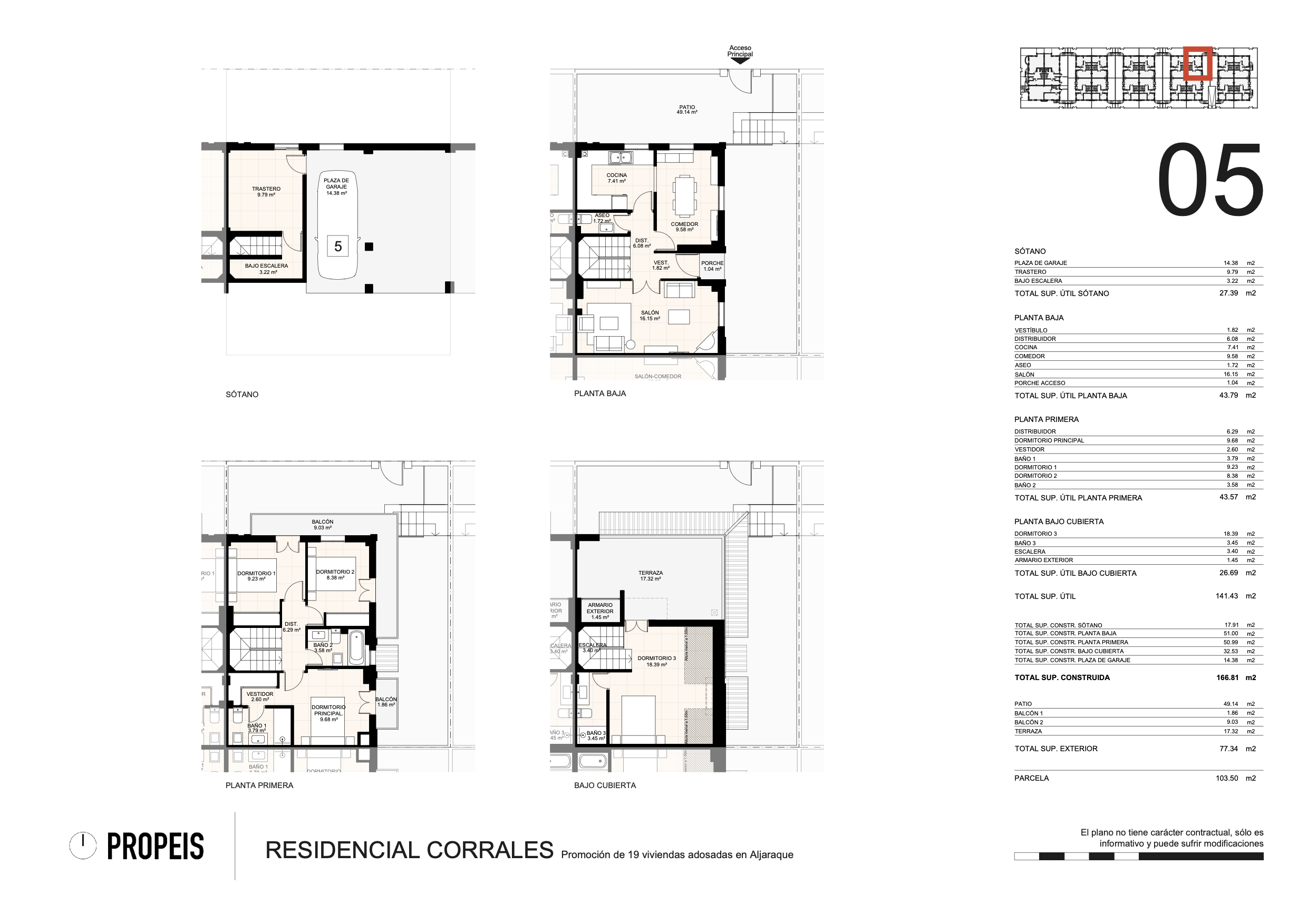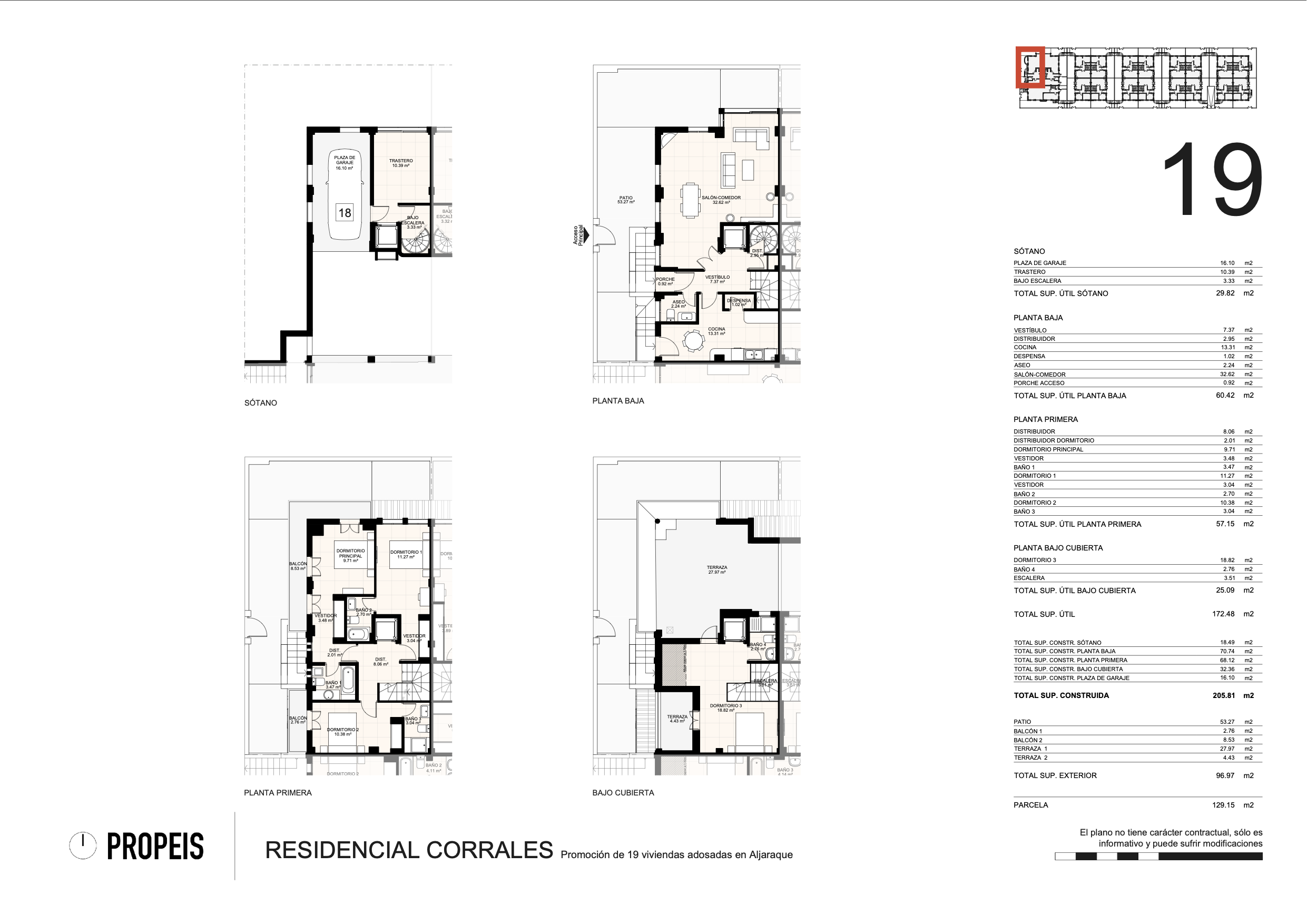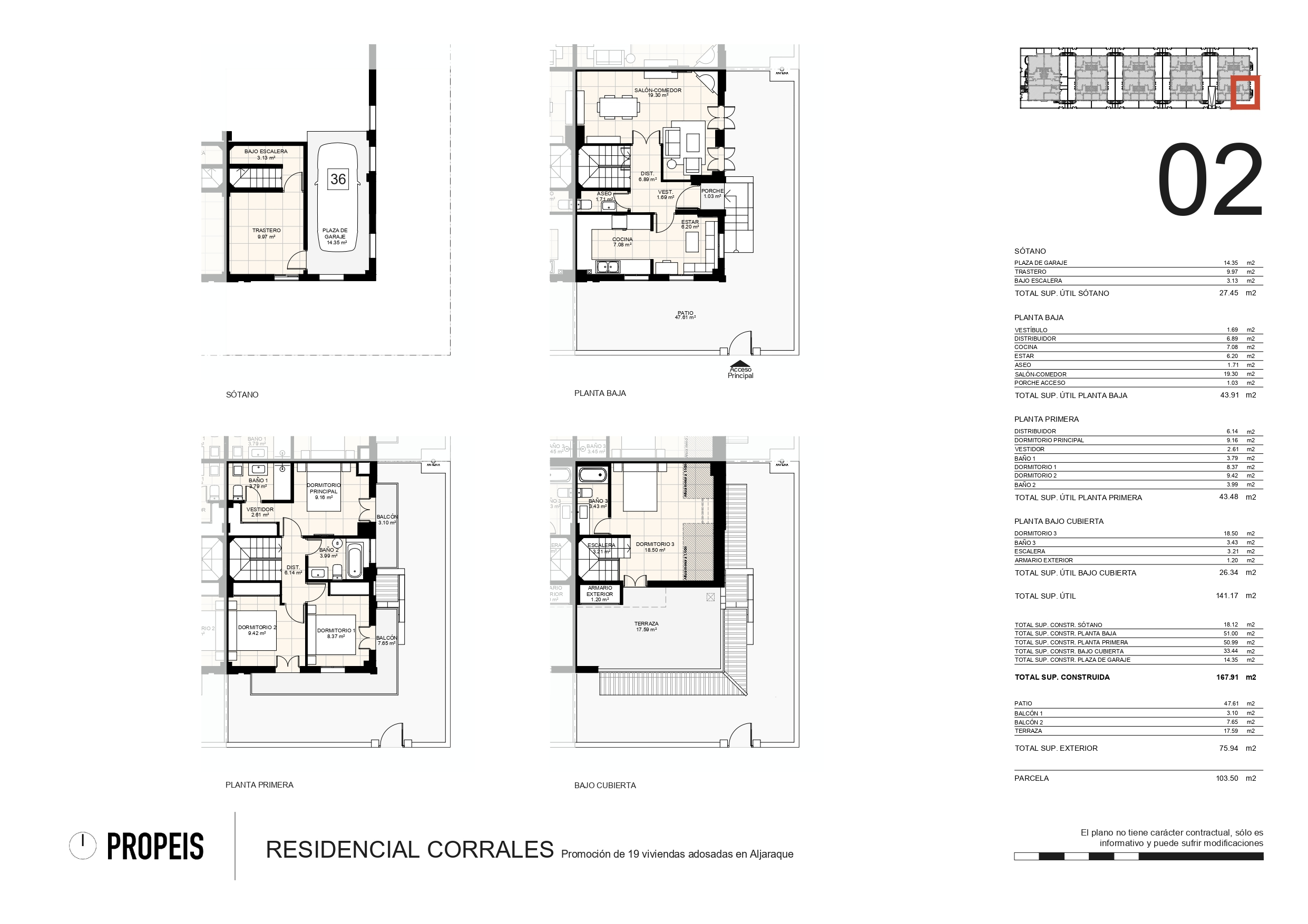 Cada tipo tiene patios de distintos tamaños, porches, terrazas e incluso, garajes. Todas comparten una distribución funcional y bien aprovechada, pero los espacios exteriores y las dimensiones hacen que cada vivienda sea única. Todas las viviendas cuentan con una plaza de garaje, pero además quien quiera puede comprar uno o más plazas adicionales. Se venden también plazas sueltas, pero los compradores de vivienda tendrán prioridad durante un tiempo limitado para decidirlo.