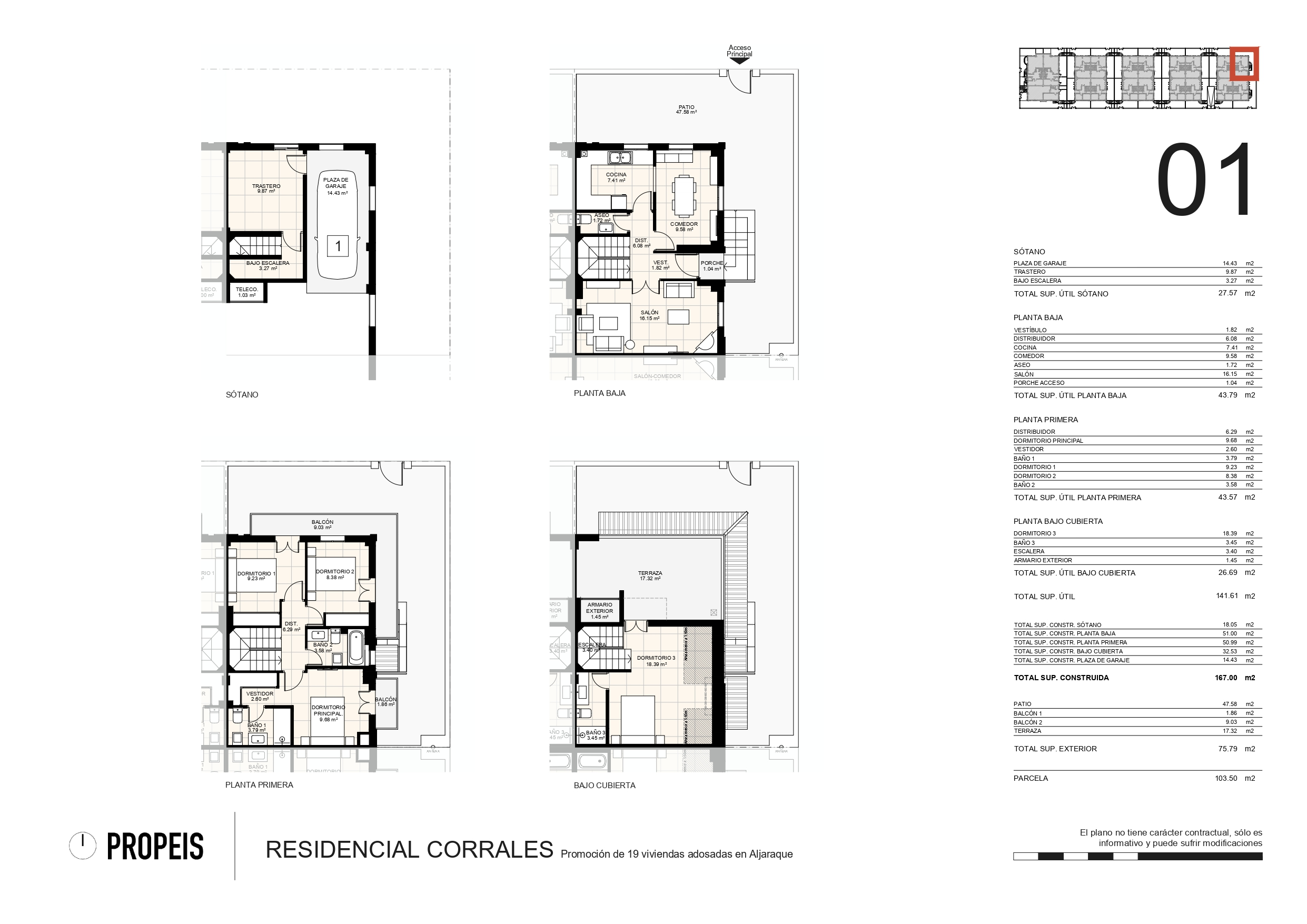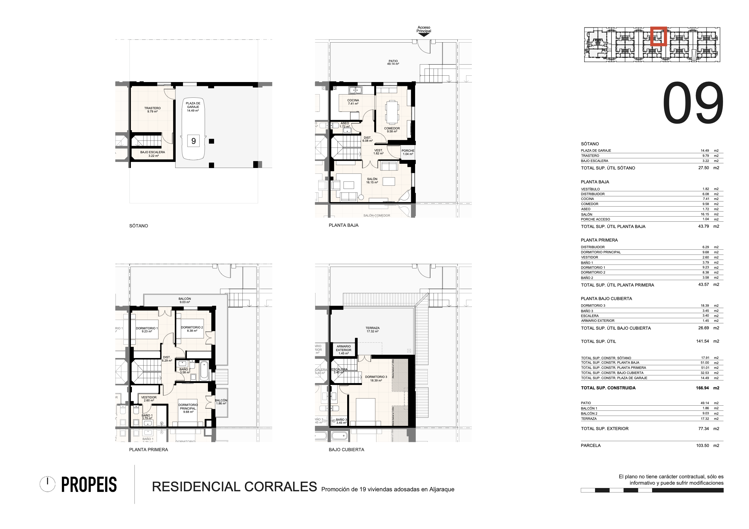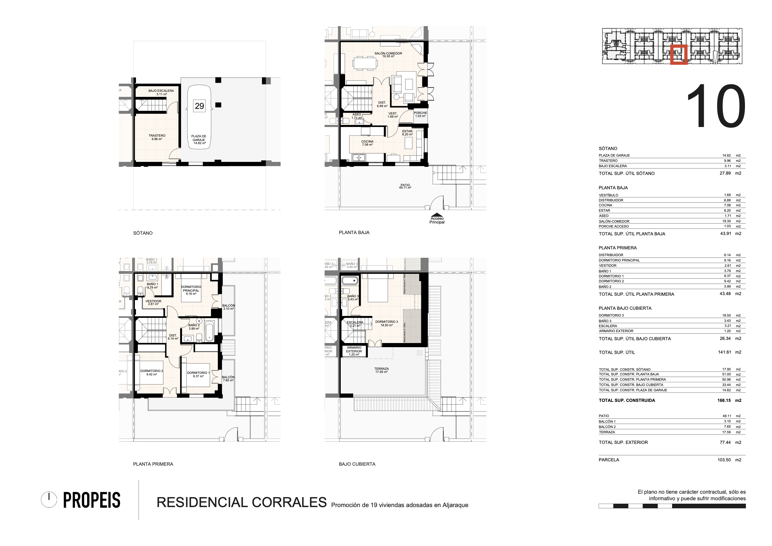 Cada tipo tiene patios de distintos tamaños, porches, terrazas e incluso, garajes. Todas comparten una distribución funcional y bien aprovechada, pero los espacios exteriores y las dimensiones hacen que cada vivienda sea única. Todas las viviendas cuentan con una plaza de garaje, pero además quien quiera puede comprar uno o más plazas adicionales. Se venden también plazas sueltas, pero los compradores de vivienda tendrán prioridad durante un tiempo limitado para decidirlo.