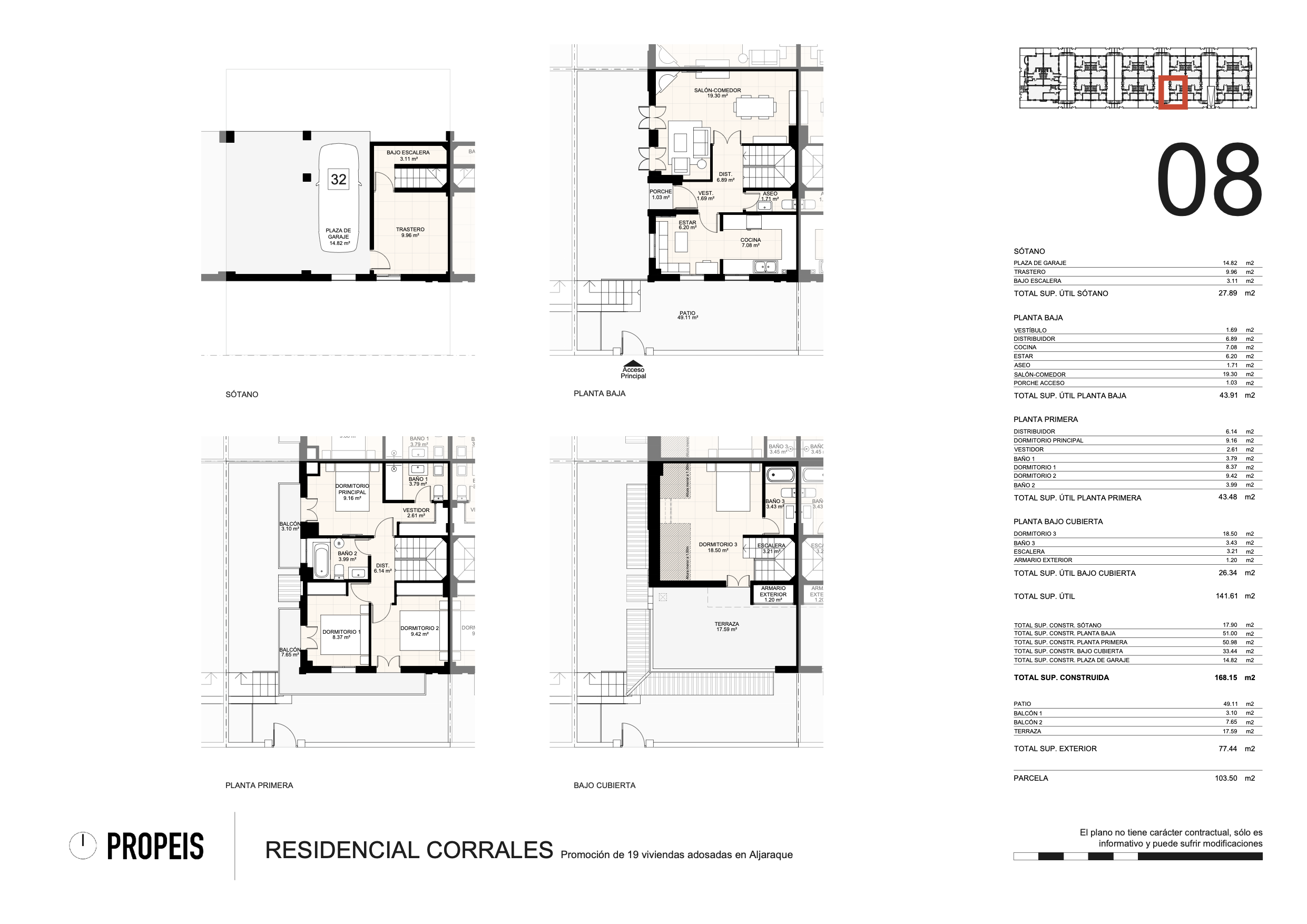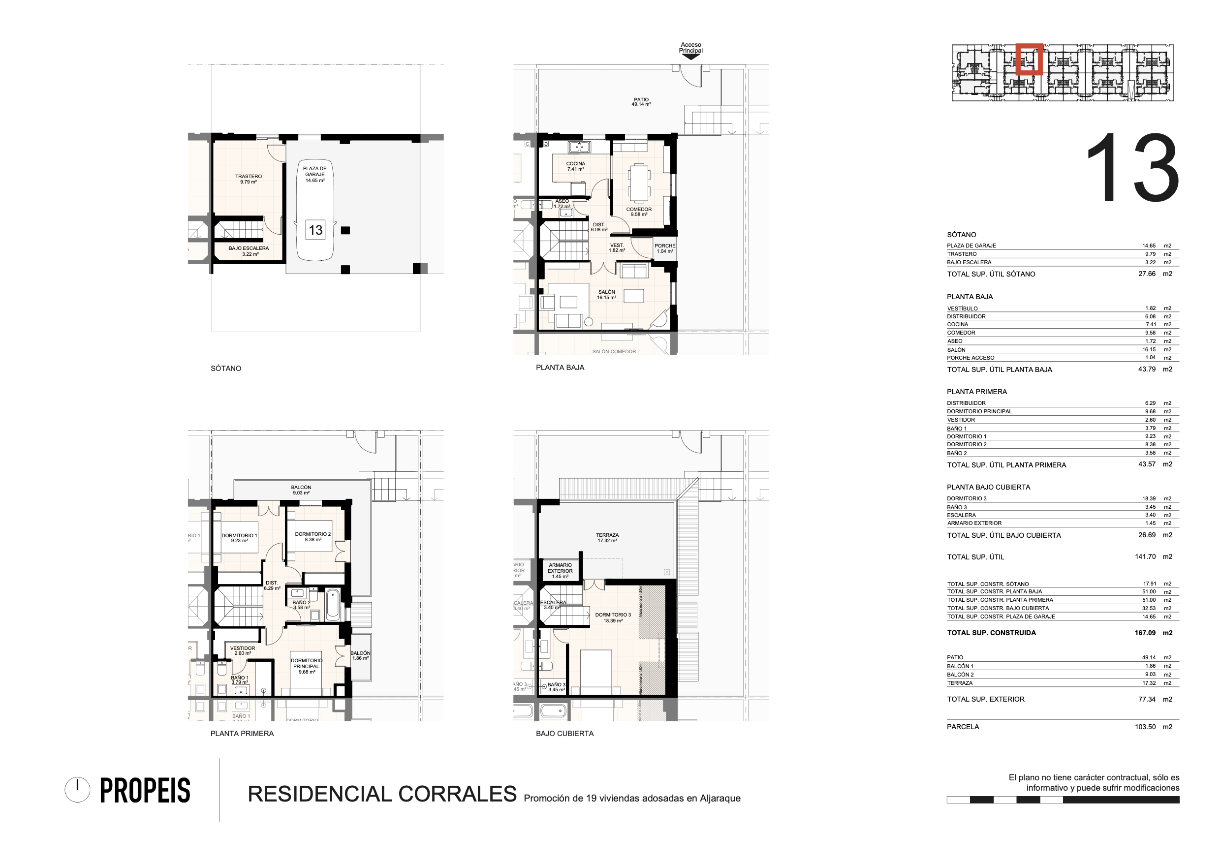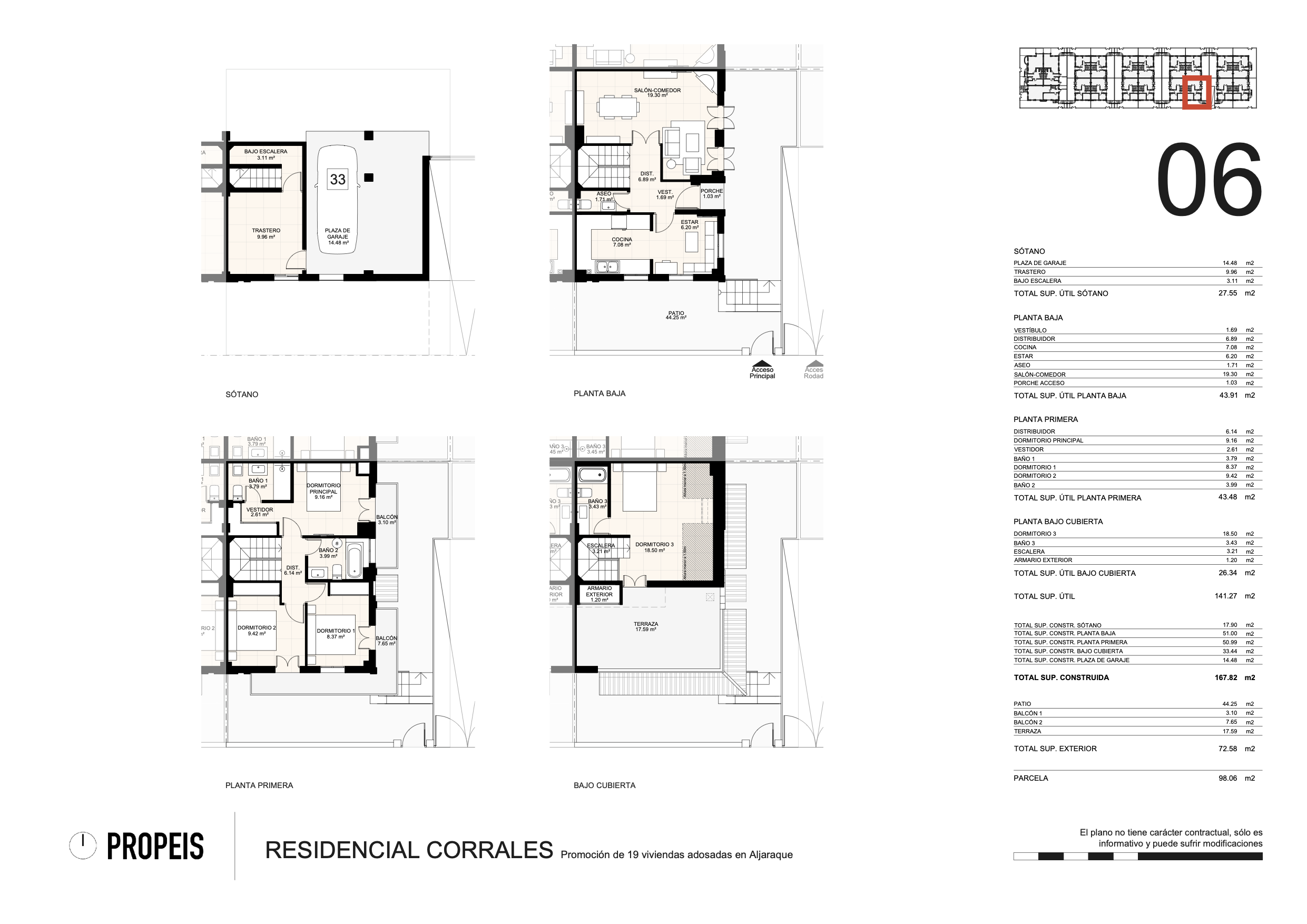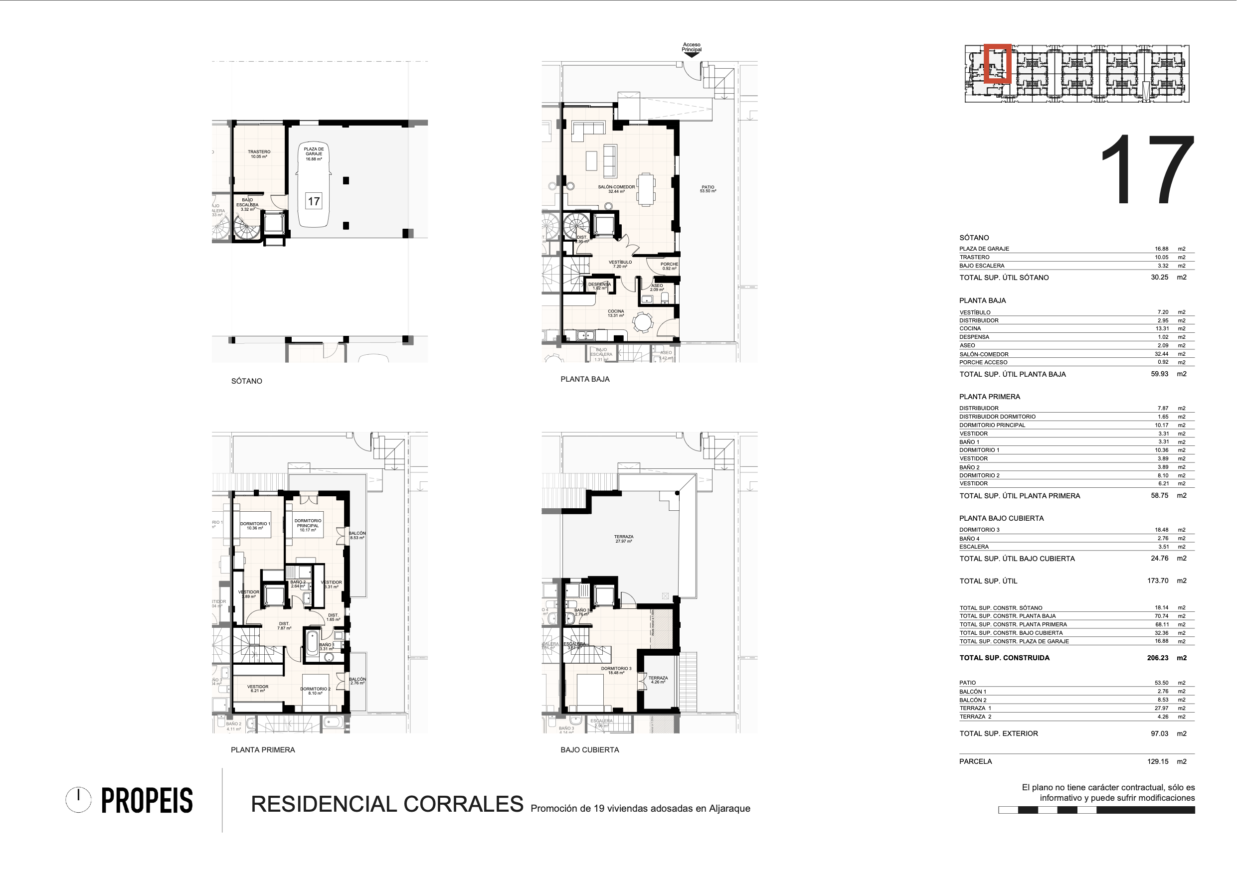 Cada tipo tiene patios de distintos tamaños, porches, terrazas e incluso, garajes. Todas comparten una distribución funcional y bien aprovechada, pero los espacios exteriores y las dimensiones hacen que cada vivienda sea única. Todas las viviendas cuentan con una plaza de garaje, pero además quien quiera puede comprar uno o más plazas adicionales. Se venden también plazas sueltas, pero los compradores de vivienda tendrán prioridad durante un tiempo limitado para decidirlo.