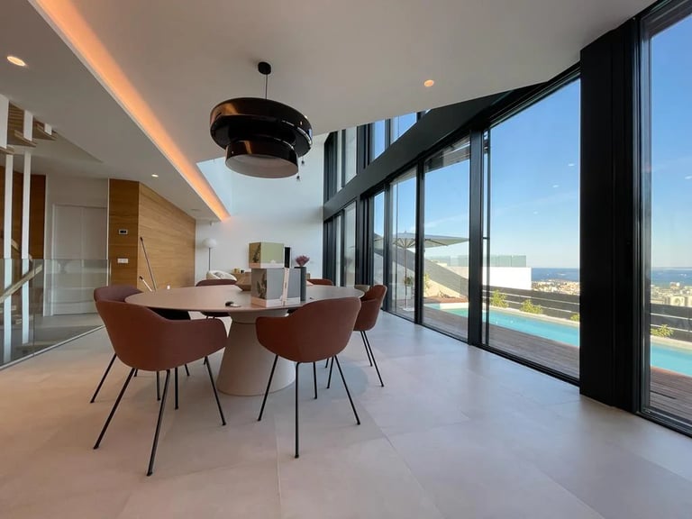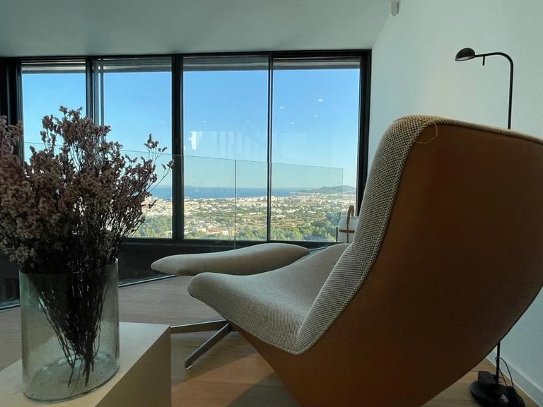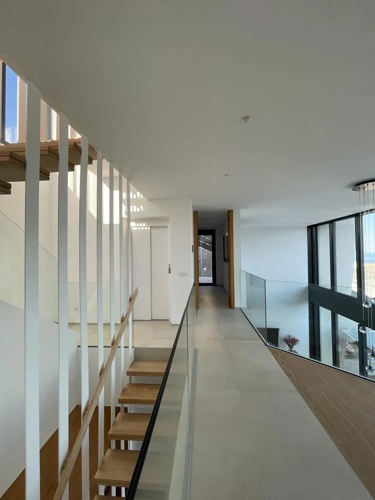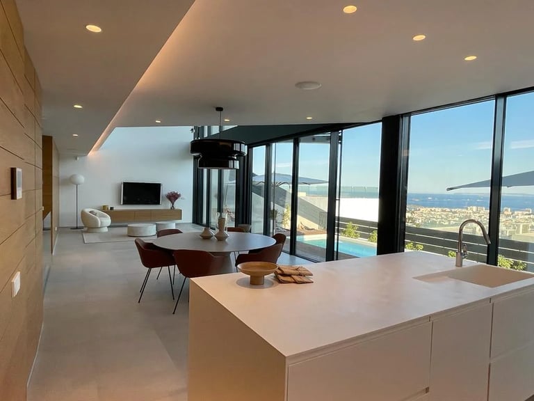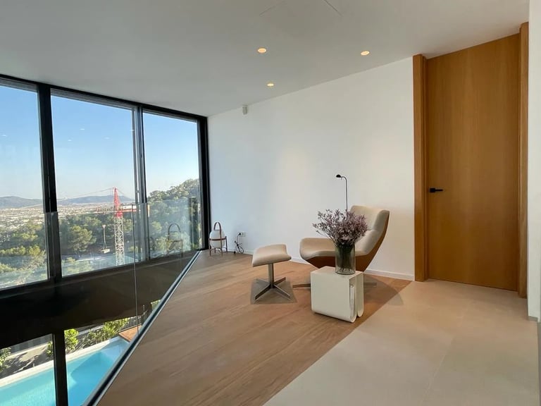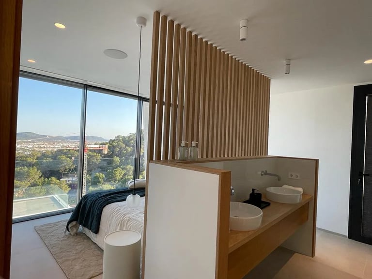 Esta villa, situada en una zona privilegiada junto al mirador de Benimusa en Ibiza, ofrece un espectáculo visual inigualable. Su ubicación en una ladera permite disfrutar de vistas directas a la ciudad y al mar, creando un ambiente único y privilegiado. La ingeniosa arquitectura de la vivienda se adapta al desnivel del terreno, permitiendo el acceso a través de la cubierta, la cual se ha habilitado como zona de parking. Este diseño singular provoca una experiencia emocionante al descender por las escaleras colgantes, donde cada paso revela panorámicas deslumbrantes. La estructura de hormigón armado, con su morfología contundente, se complementa con espacios luminosos que están impregnados de vistas encantadoras, haciendo de esta villa un verdadero refugio visual en el corazón de Ibiza.